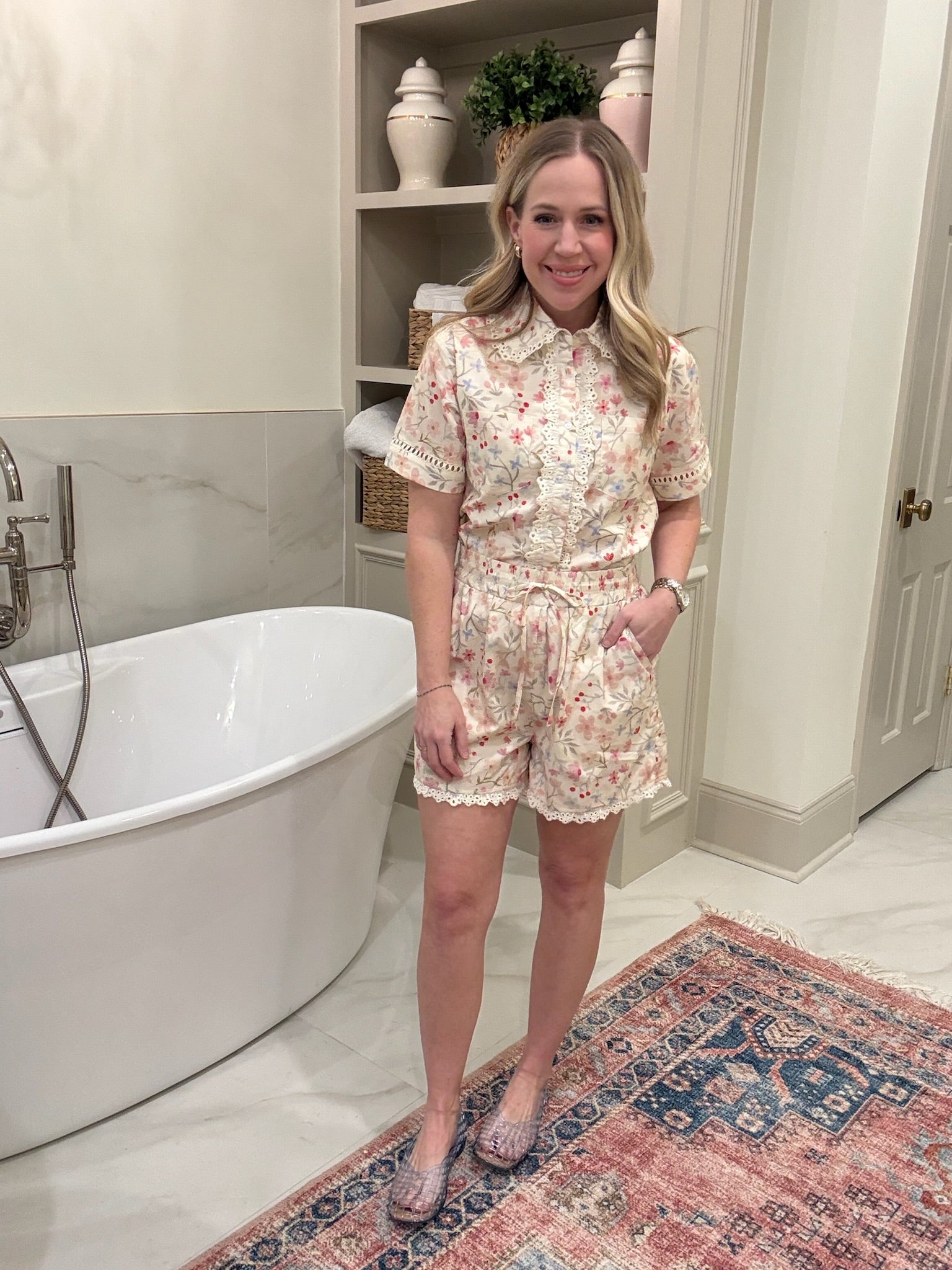 Features: pull on floral short with smocked waistband, adjustable tie, scallop trim, pair with the Jacinda Floral Button Up Blouse as a matching set