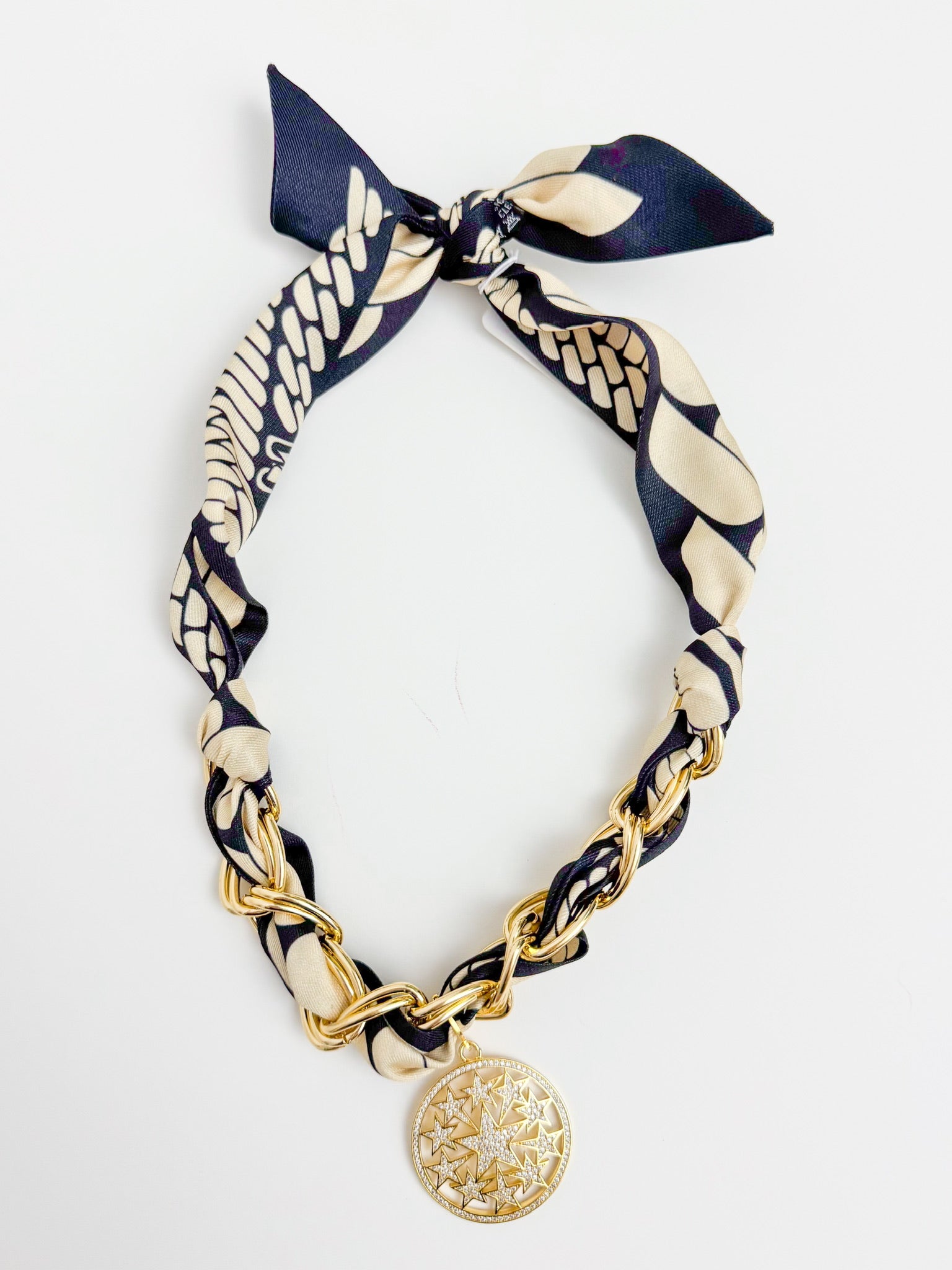 Adjustable scarf necklace with woven chain detail and an interchangeable 18K gold charm
