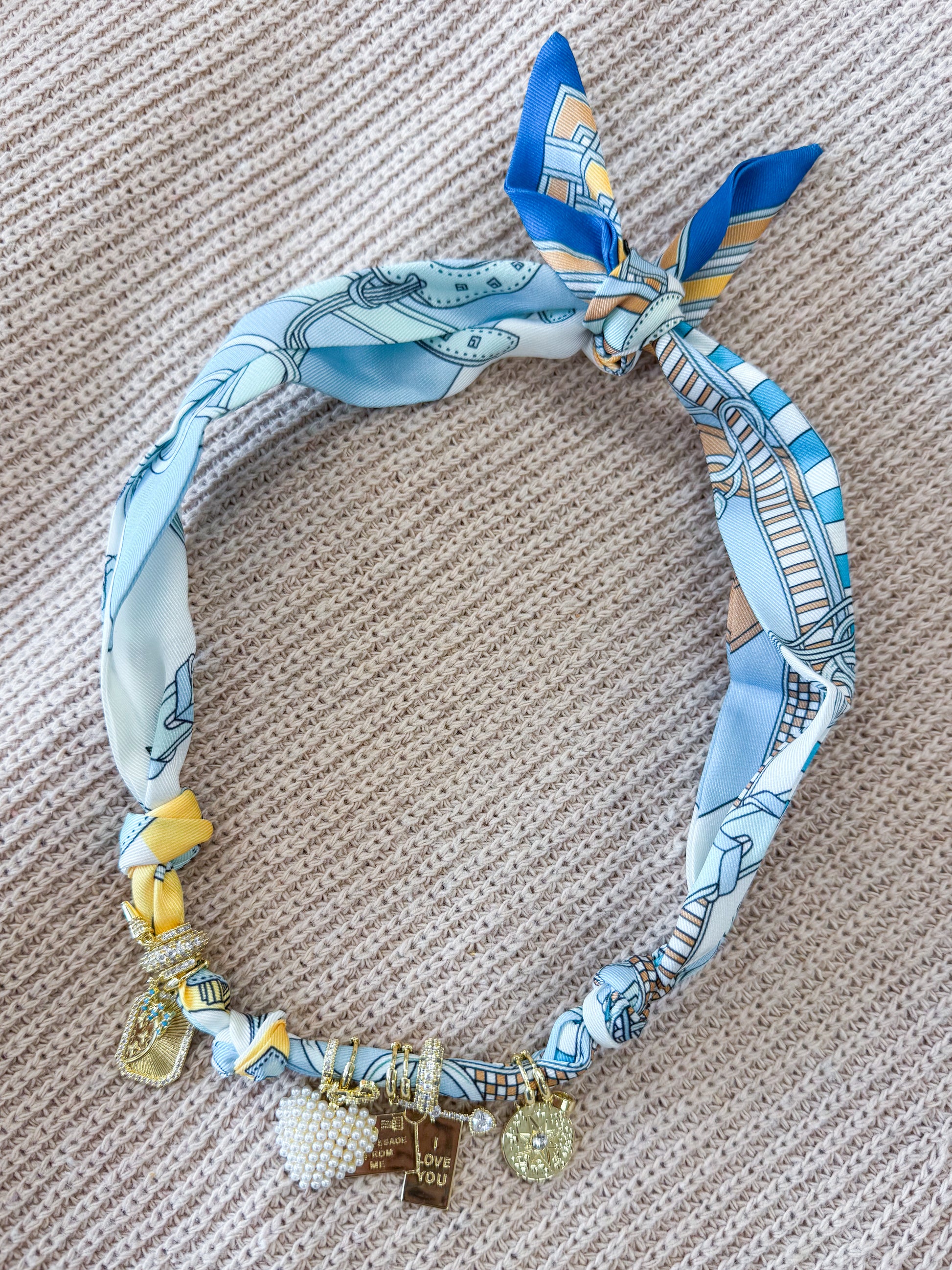 Versatile and stylish, the Blair Multi Charm Scarf Necklace is a must-have statement piece. This best-selling design features a luxurious scarf adorned with nine gold-plated CZ charms, including a pear CZ, love notes, a heart, and stars. Handmade in Dallas, TX, this unique accessory is perfect for layering or wearing as a statement piece, adding a chic and meaningful touch to any look.