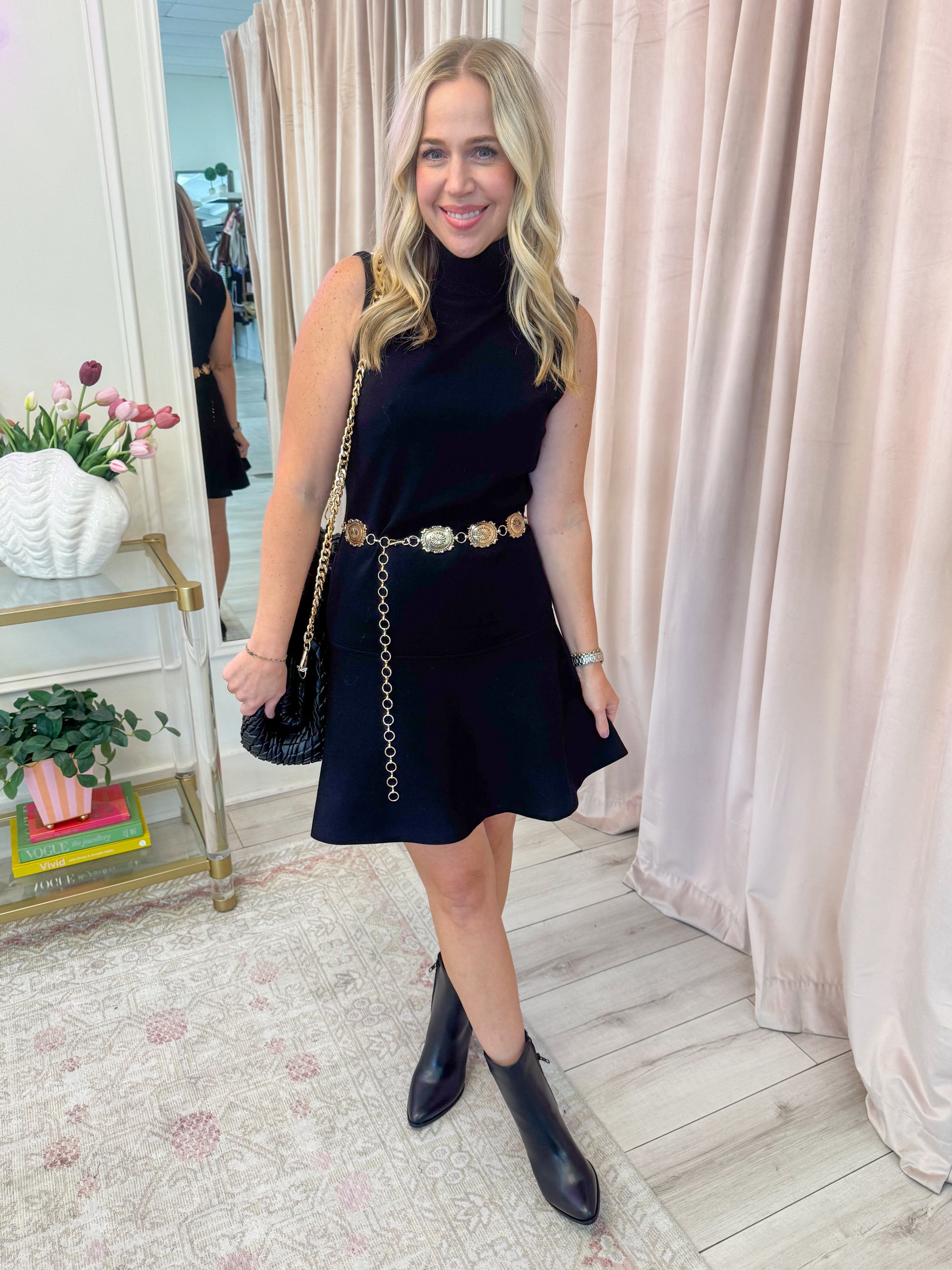 Features: turtleneck, soft lightweight knit, flare skirt, sleeveless silhouette