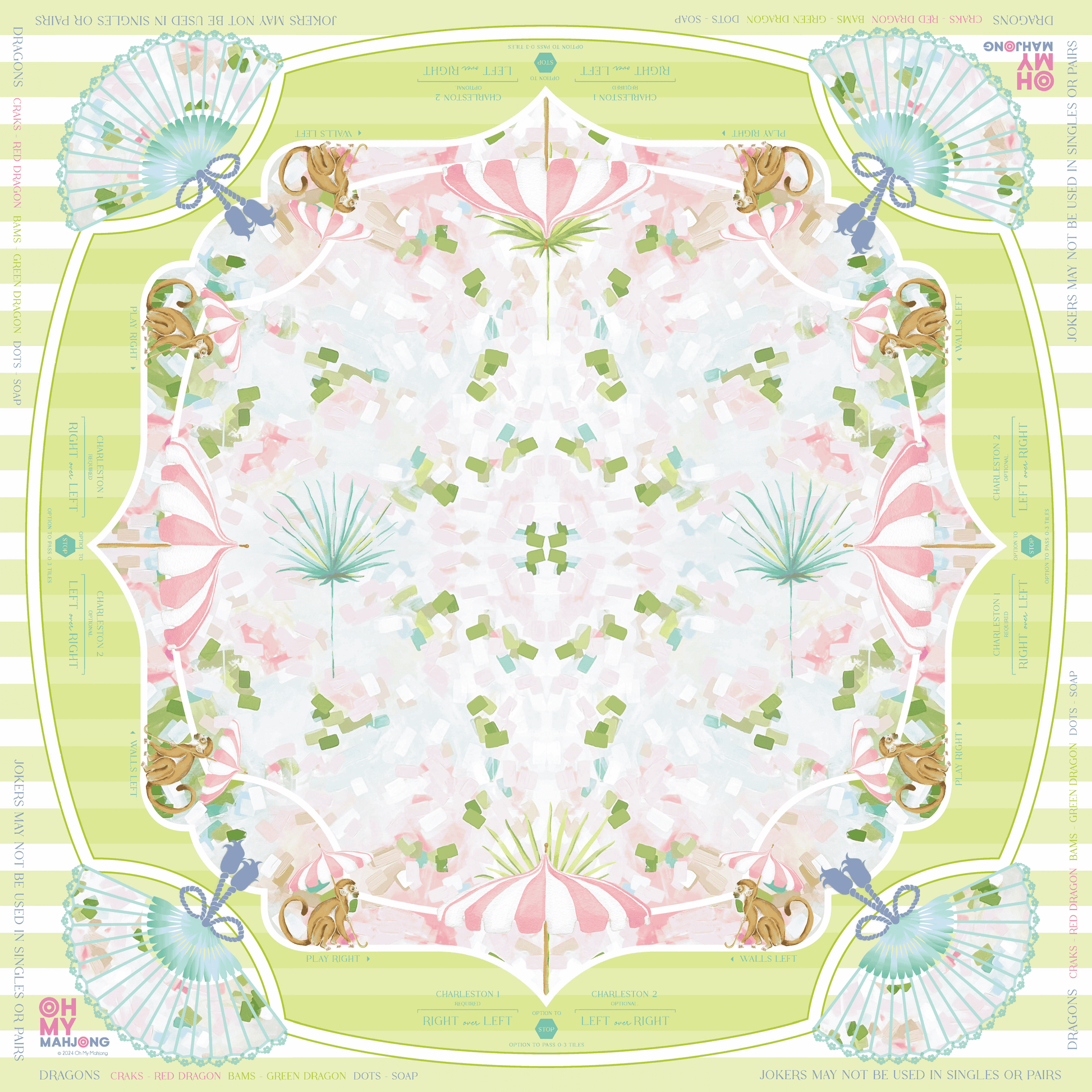 The Capri Mahjong Mat, crafted in collaboration with Catherine Cartie, brings a slice of Italian beauty to your game table. Designed to complement the lively Limoncello Tiles, this mat is full of captivating purple, pink, and green shades. The Capri mat is a vibrant masterpiece inspired by coastal Italian vibes and warm, sunlit days. Made from neoprene for easy cleanup and featuring a secure rubber non-slip backing, Capri ensures a flawless playing experience. Instructional reminders line the edges for a game that’s as smooth as it is stylish.