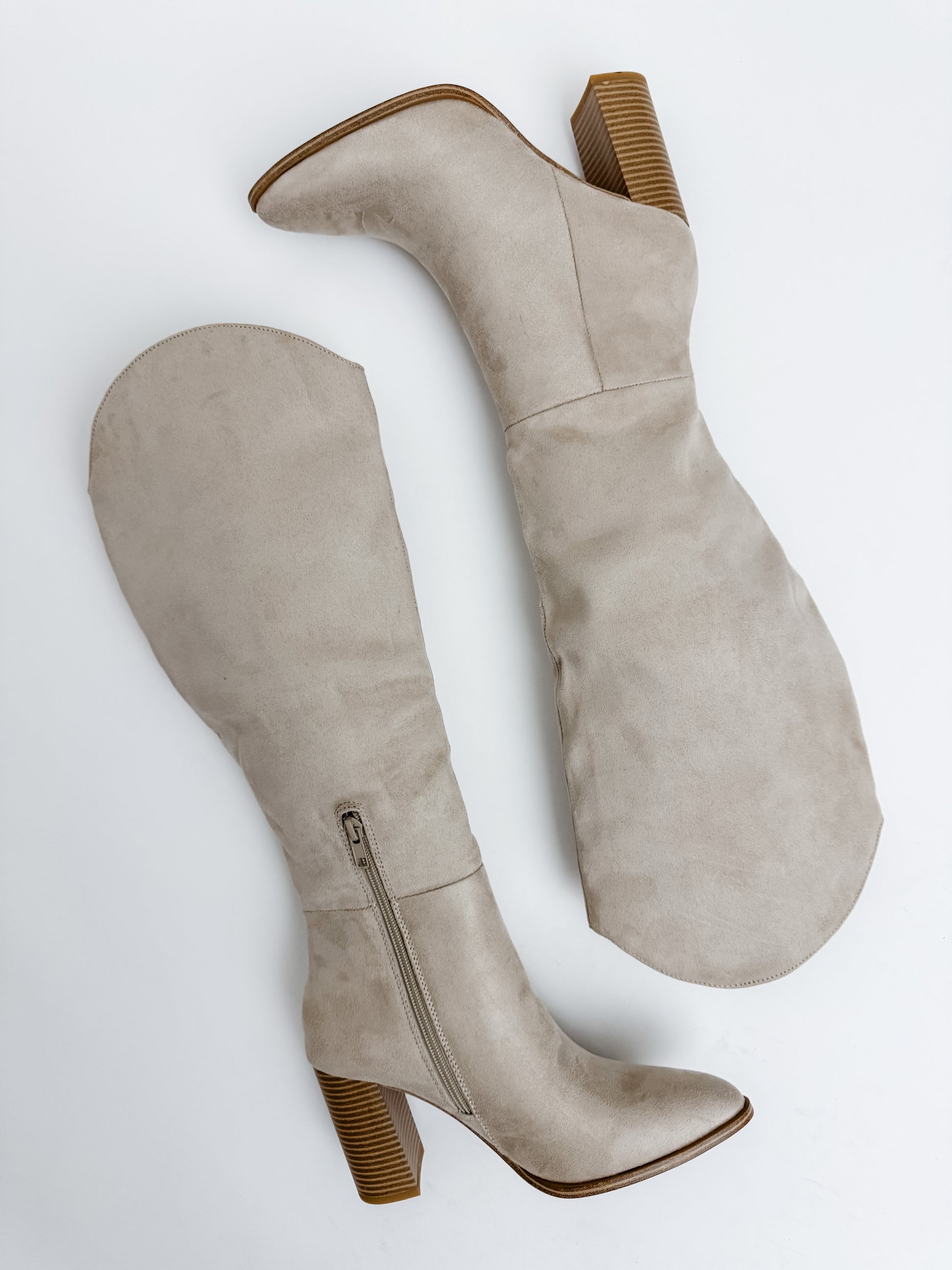 Features: tall boot with stacked high heel, micro suede, side zip closure