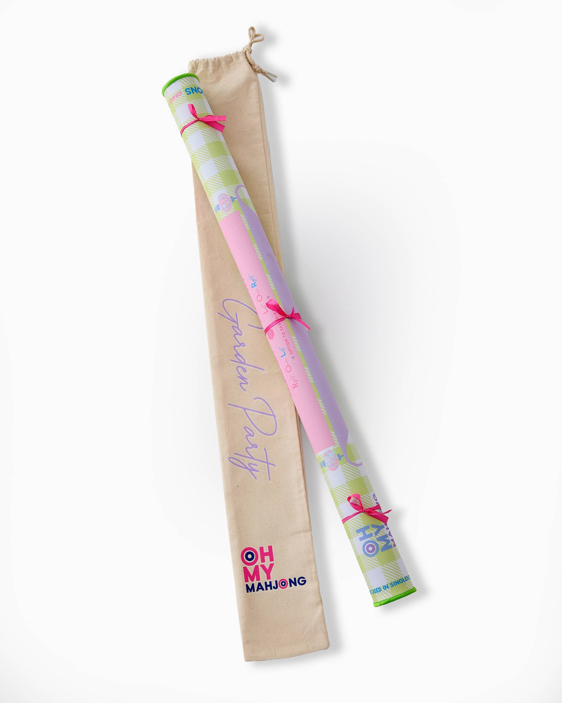 Introducing the Garden Party Mahjong Mat—a delightful combination of vibrant pastel hues and enchanting florals, intertwined with a charming green gingham pattern. This neoprene mat features a non-slip bottom to ensure your tiles stay perfectly in place, game after game. Adorned with delicate blossoms and inviting colors, it exudes a frilly femininity that is both elegant and playful. Along the sides of the mat, you’ll find the signature Oh My Mahjong instructional reminders, guiding you through each round.