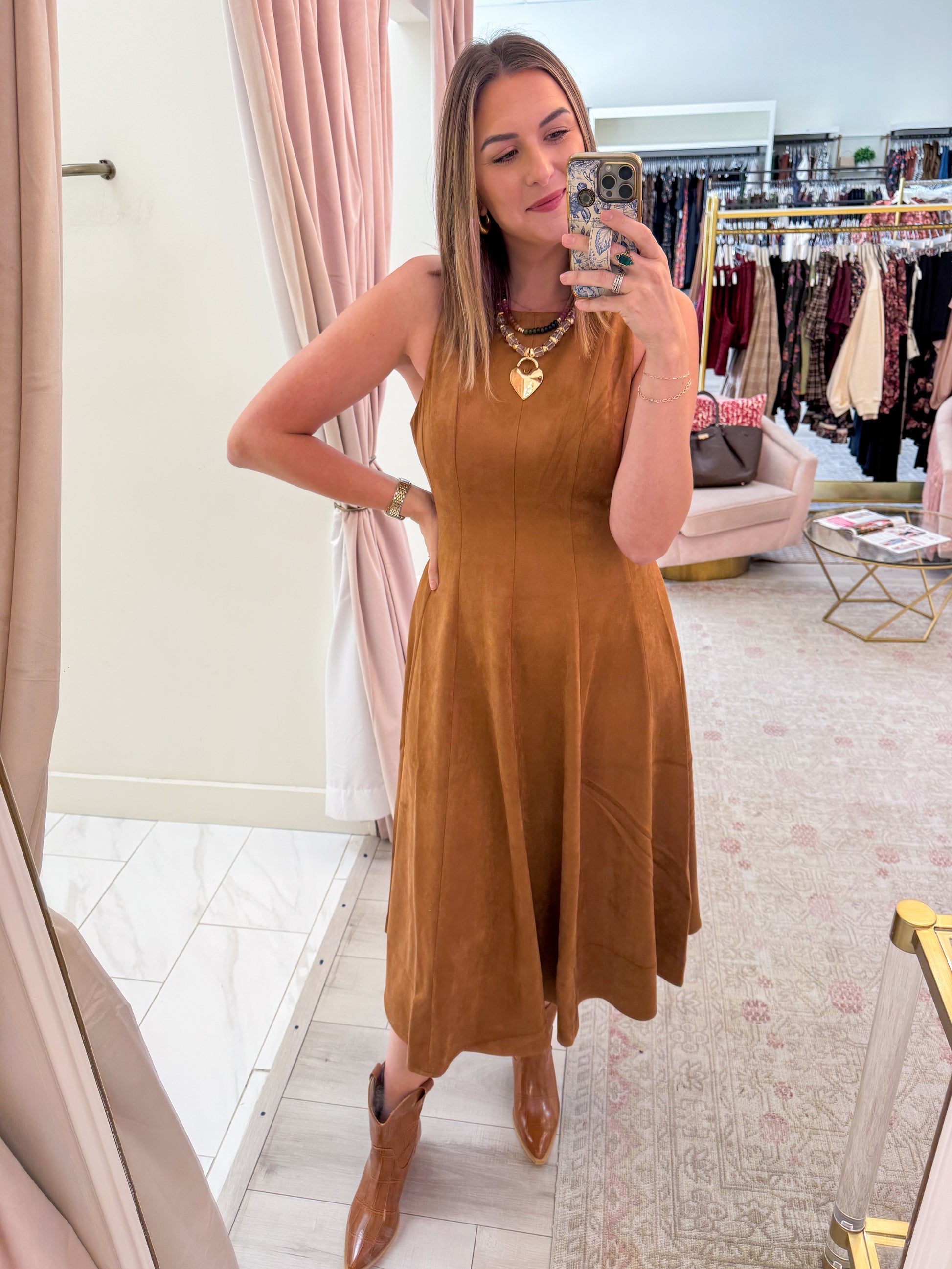 Features: round neck, back zip closure, tailored fit, fully lined, faux suede