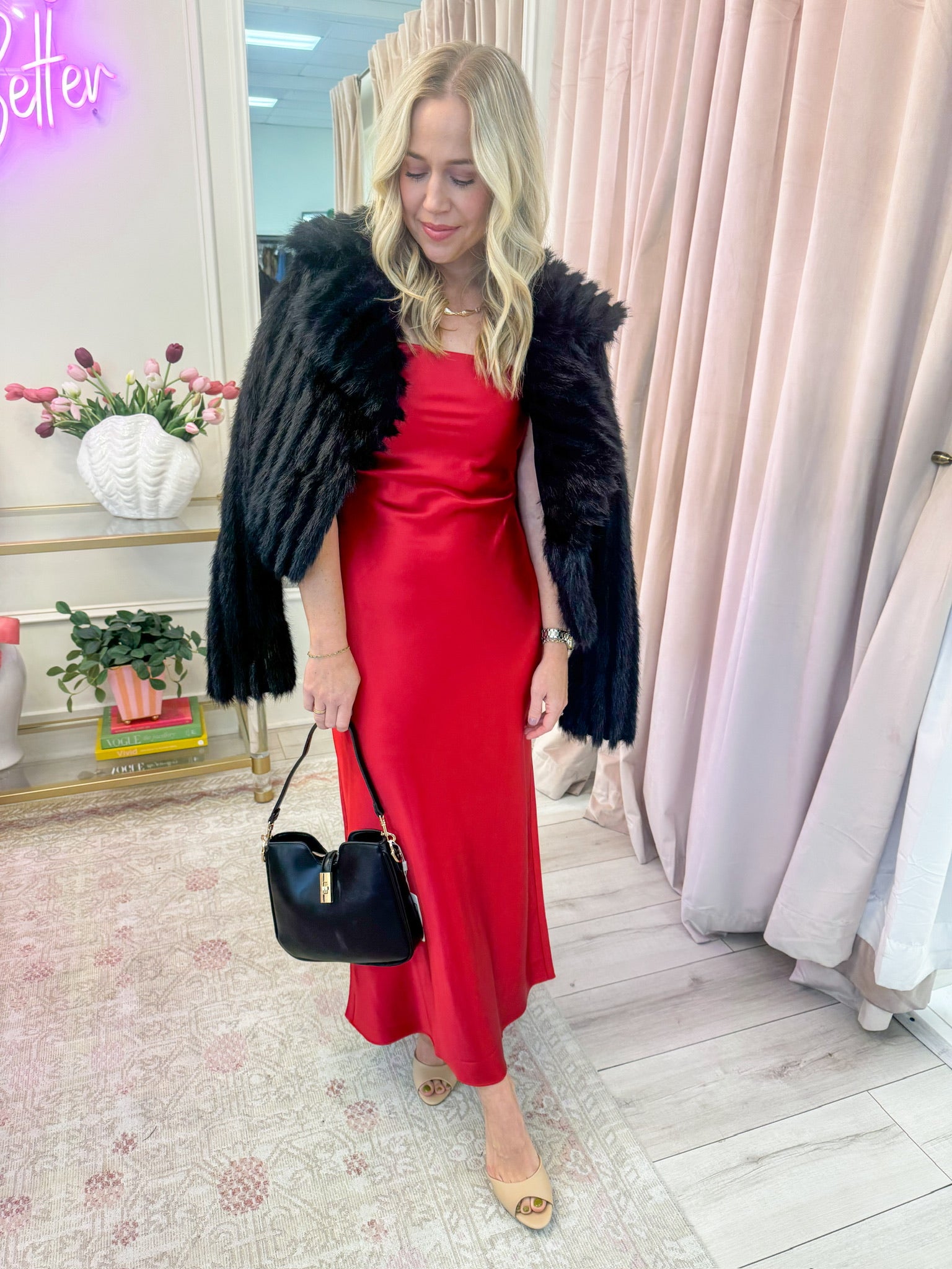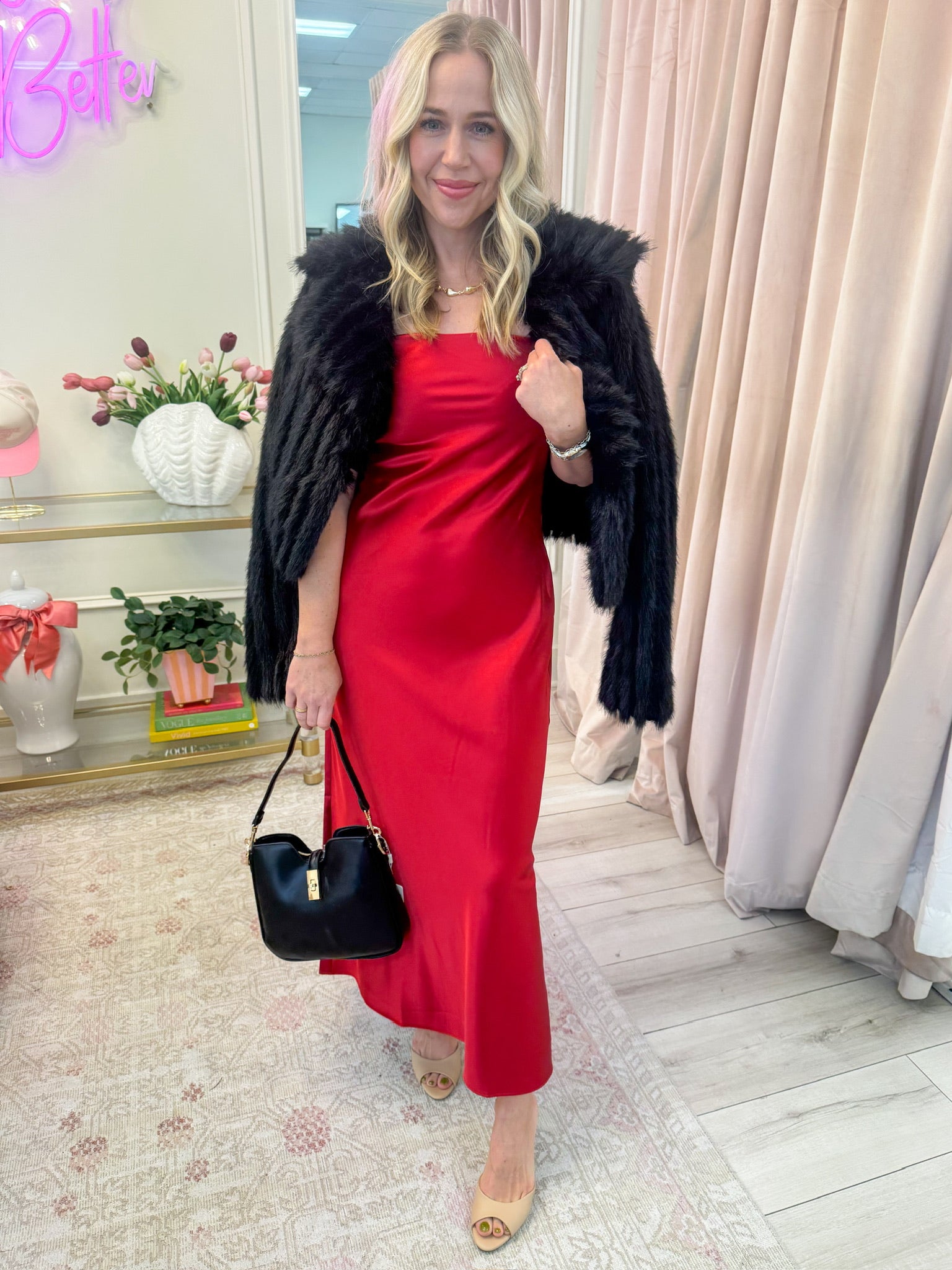 This stunning satin midi dress is sure to turn heads at your next event. Pair with a neutral heel. Perfect for a wedding guest or holiday event!