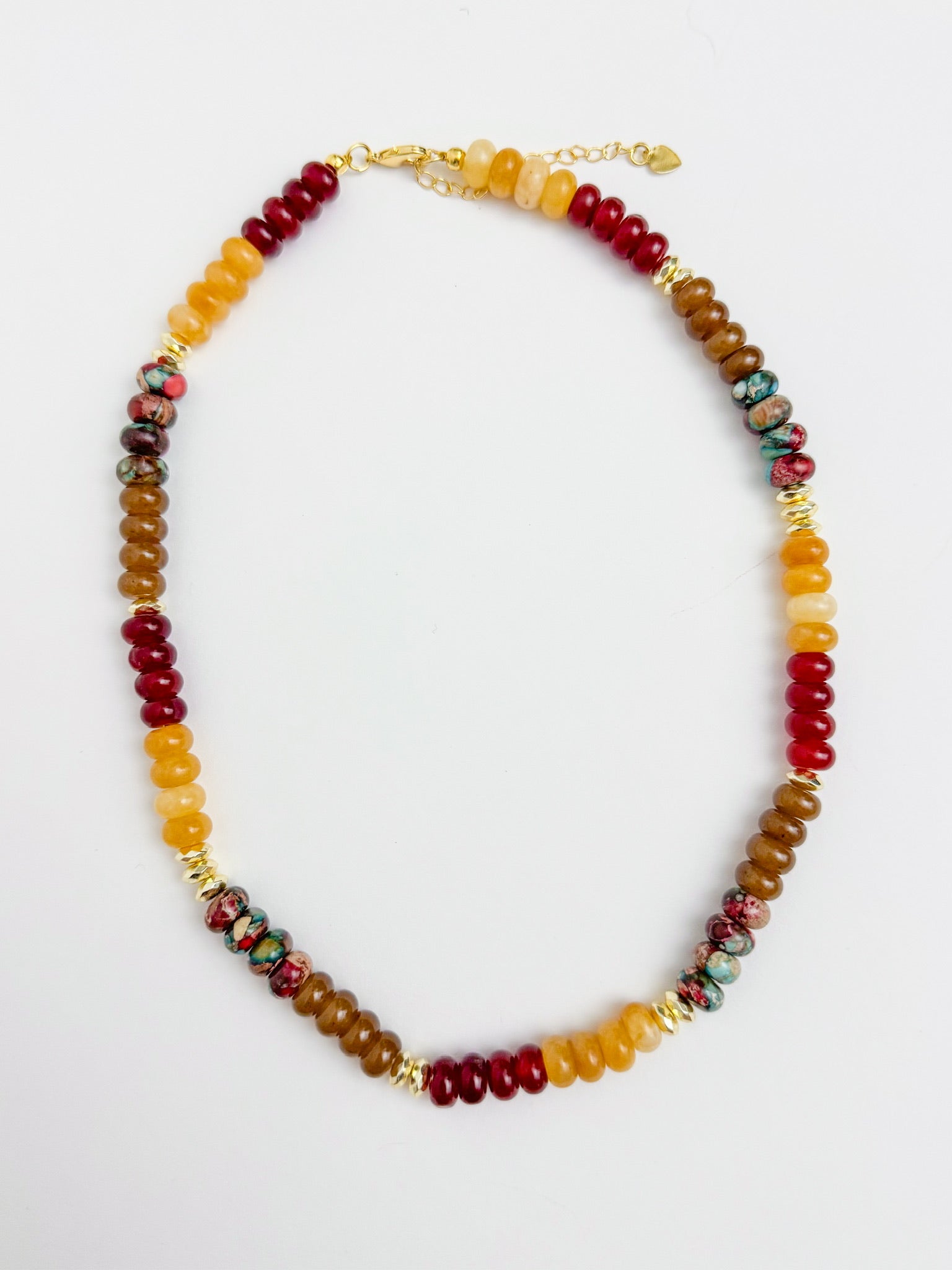 This 18” adjustable necklace features a blend of 18k gold-plated beads and natural stones. Perfect for layering or wearing solo, it’s a versatile statement piece that adds effortless sophistication to any jewelry collection.