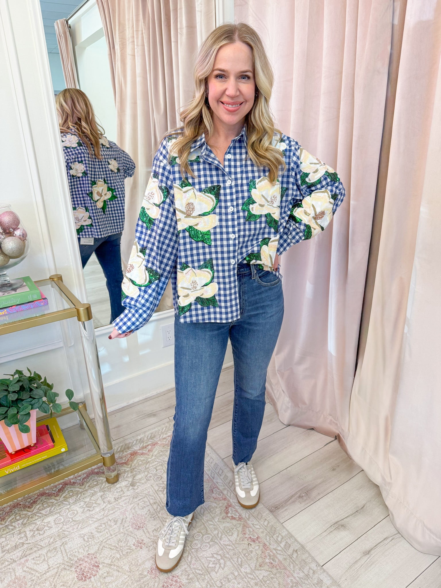 Features: collared long sleeve button up top with sequin embellished magnolias on front and back