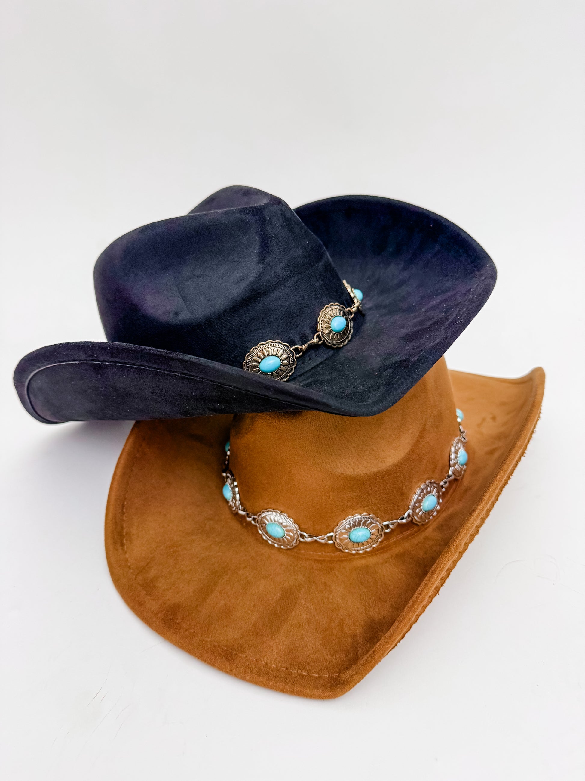 Gold & turquoise concho details on rim, inner adjustable brim