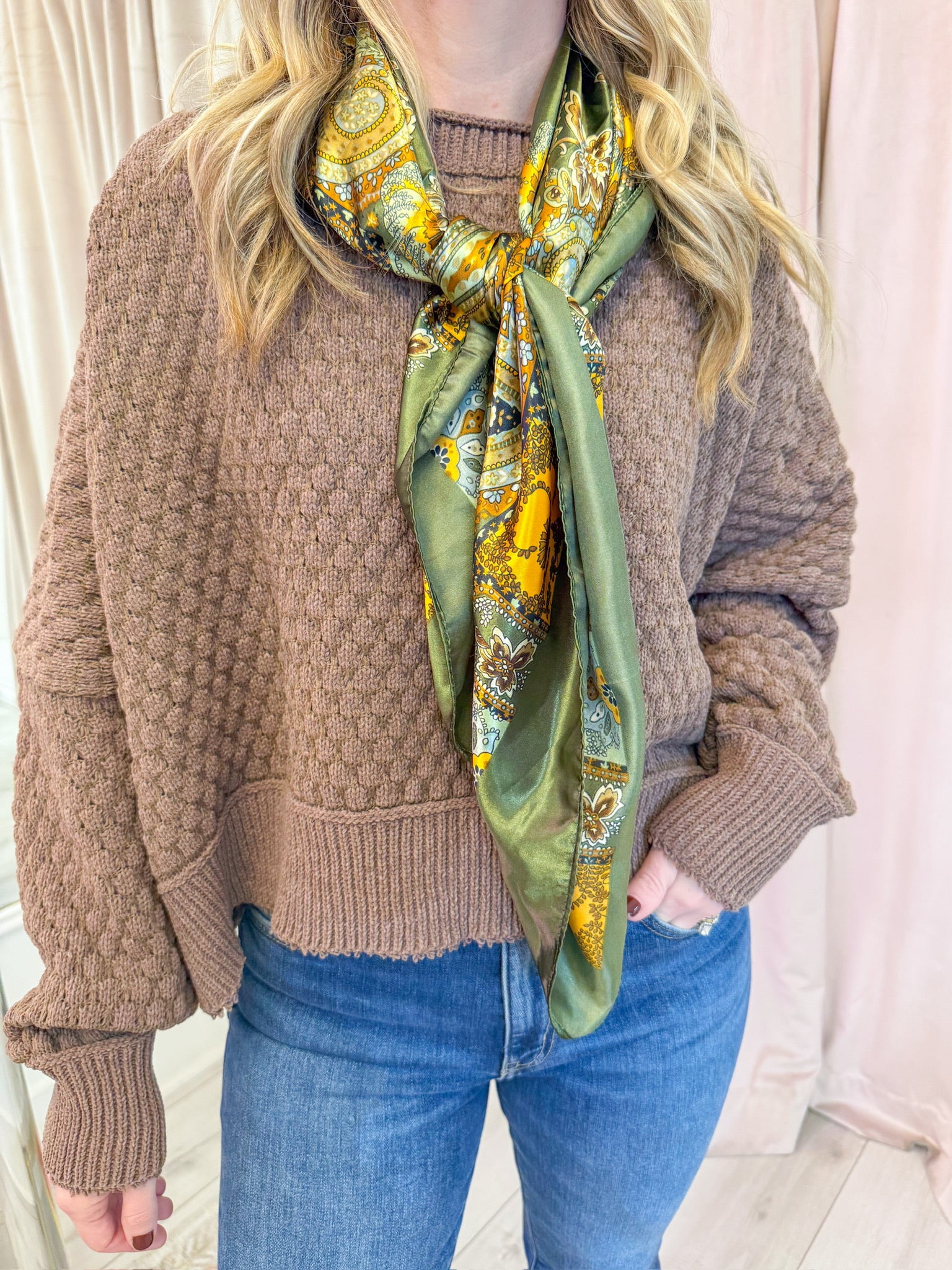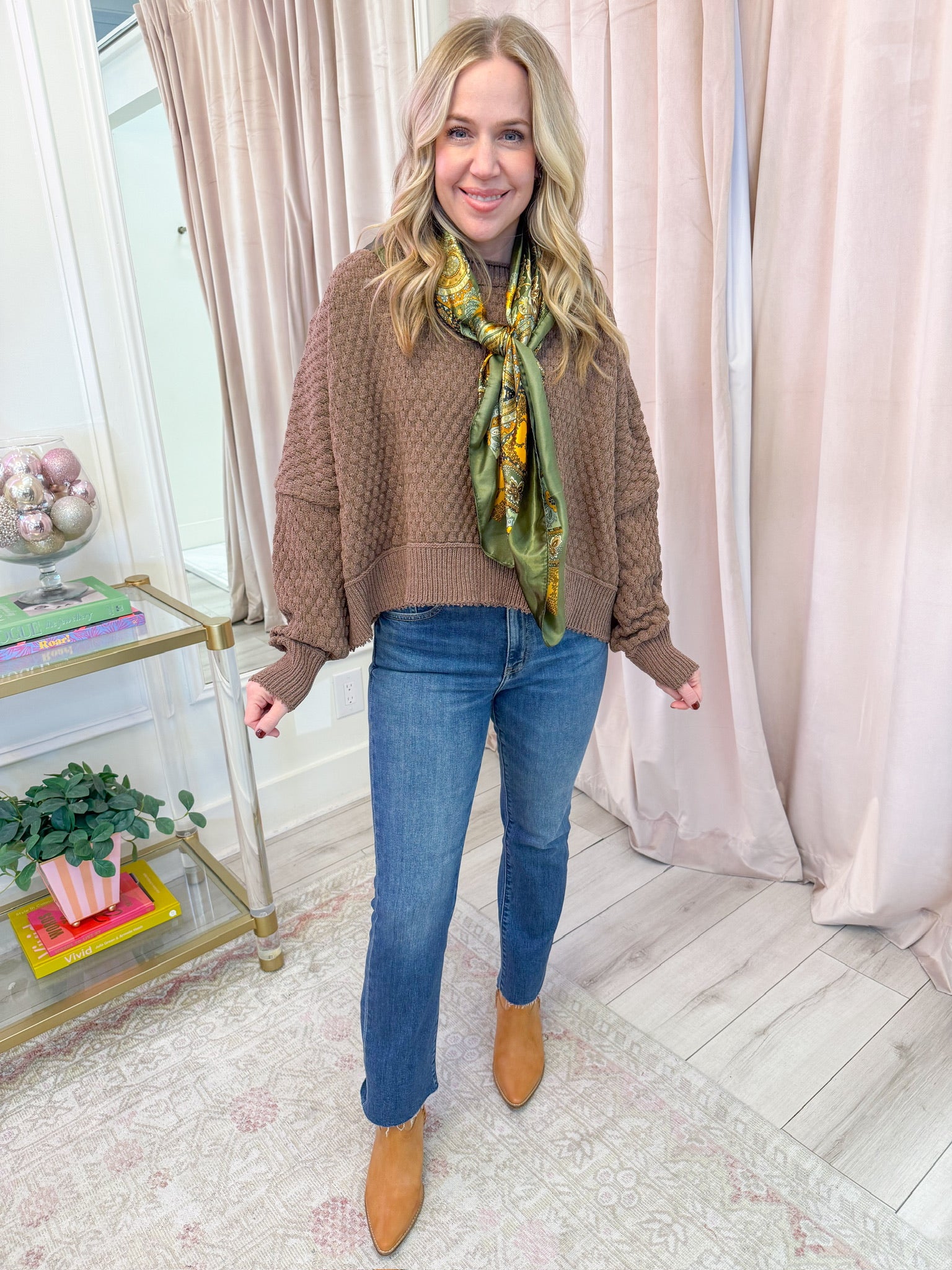 Features: textured open knit, round neck with ribbed trim on neckline, bottom hem and sleeves