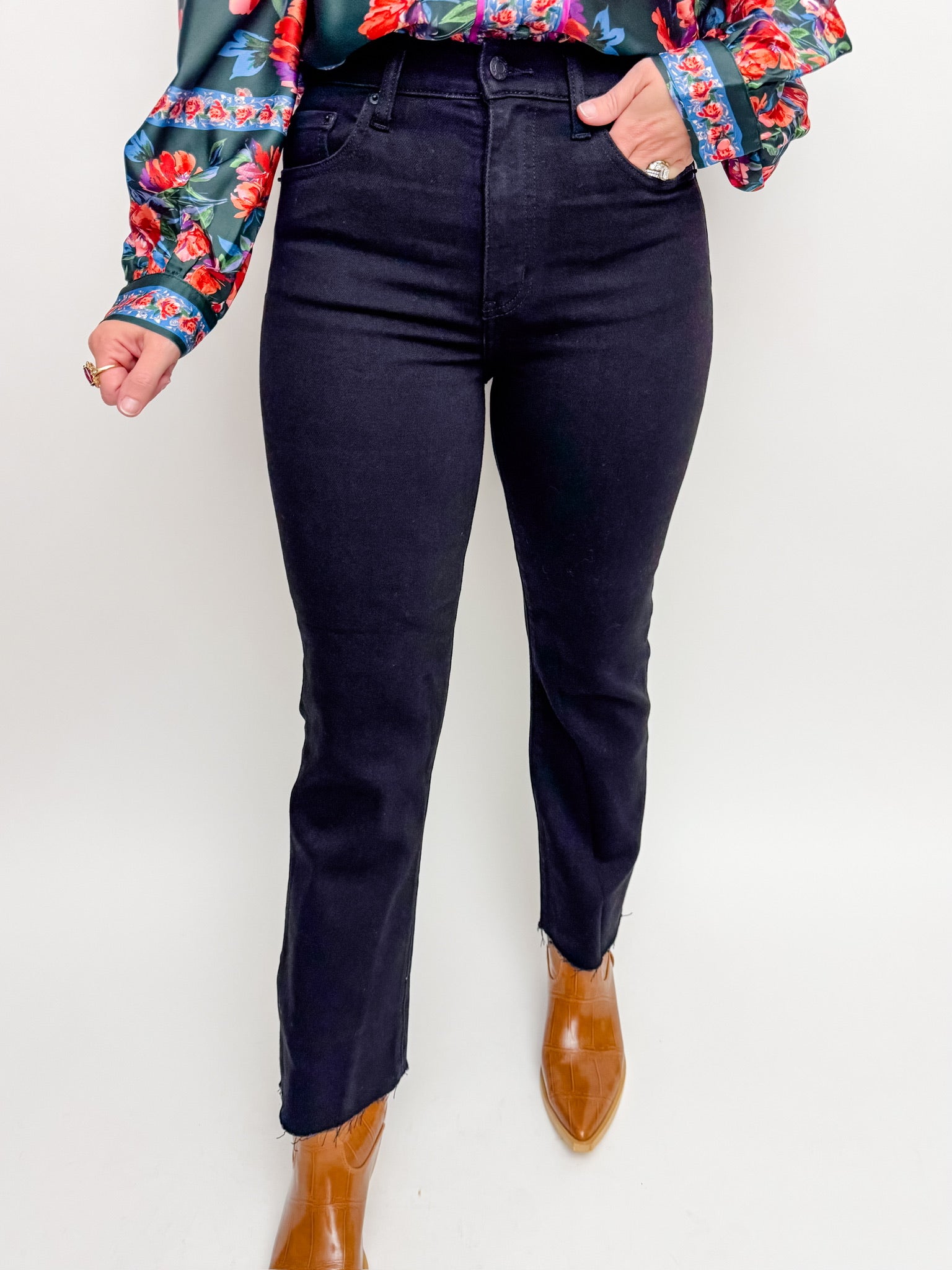 The Shy Girl in After Party is a High Rise Cropped Flare in a black wash. Clean lines and matching black hardware add to the streamlined look of this jean. Crafted from Daze Denim's form-fitting Repreve fabric, this jean is made from recycled plastic to give excess a second life — from waste to waist.