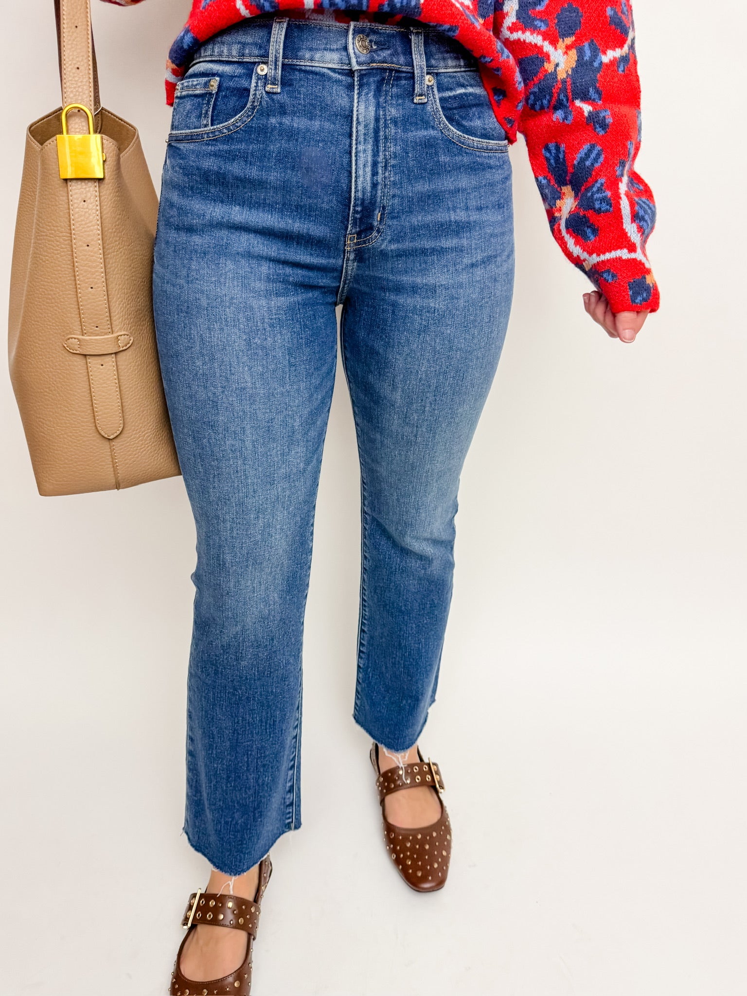 In a deep blue wash with a slight crop and scissor cut hem, the Shy Girl is a cropped flare that can be worn with any kind of shoe. Constructed in Daze Denim's "Tough Love" denim, it makes it look like an authentic vintage fit - mostly rigid but yields to your body in all the right ways.