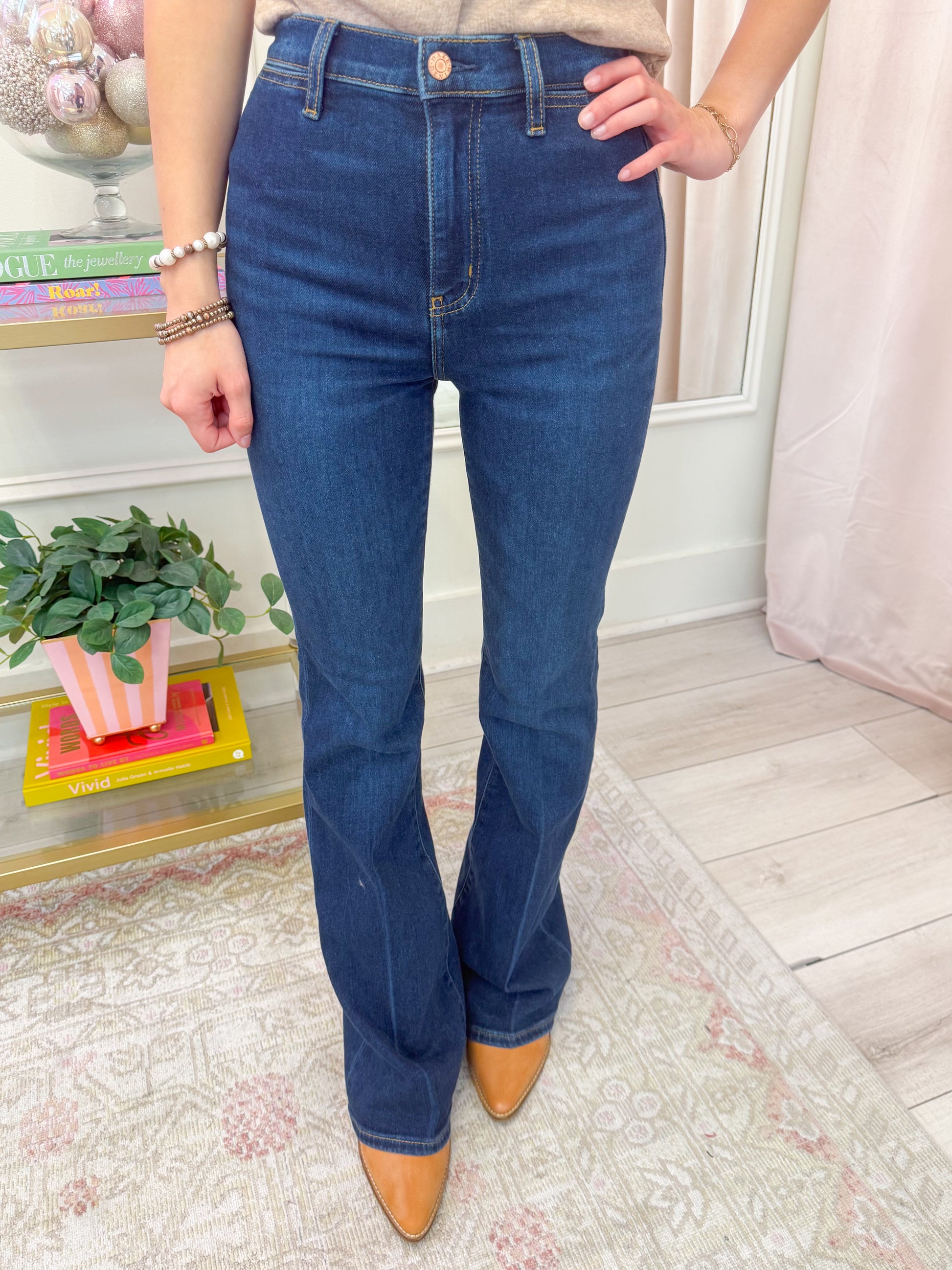 Steal the show in these high-waist, full-length flare jeans cut from stretch-kissed denim in an everyday dark wash.