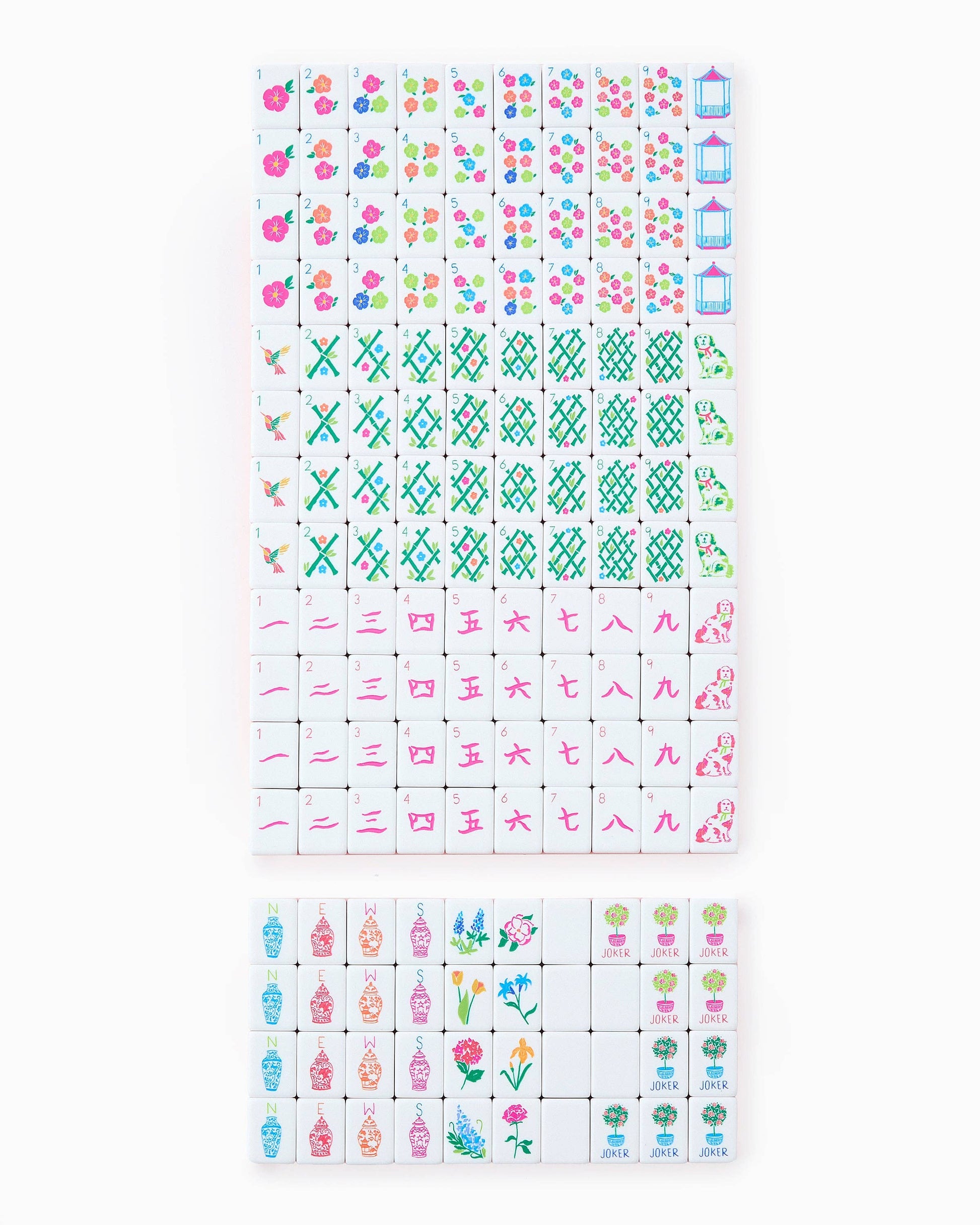 Tiles: - 160 Acrylic Tiles - 1-9 Bams, Cracks and Dots (4 of each) = 108 - N E W S (4 of each) = 16 - Red, Green and White Dragon (4 of each) = 12 - Flowers = 8 - Jokers = 10 - Blanks = 6