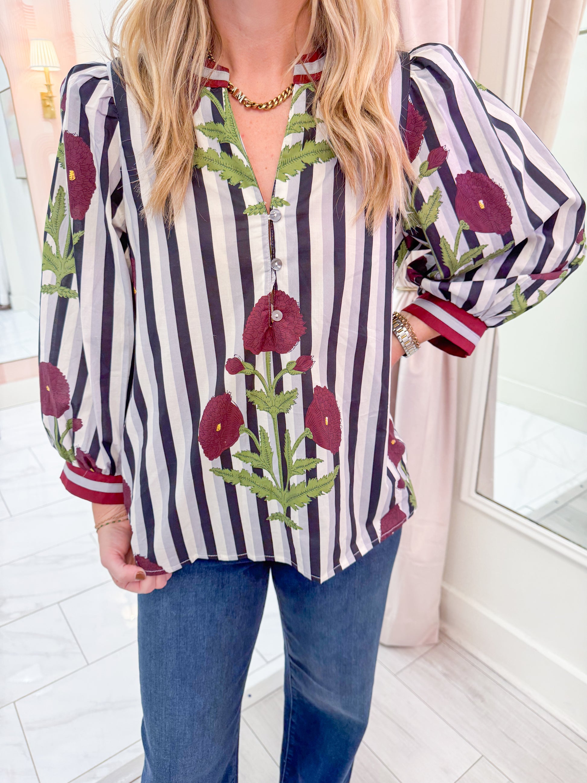Features: v-neck, button front closures, balloon sleeves, stripe hem detail