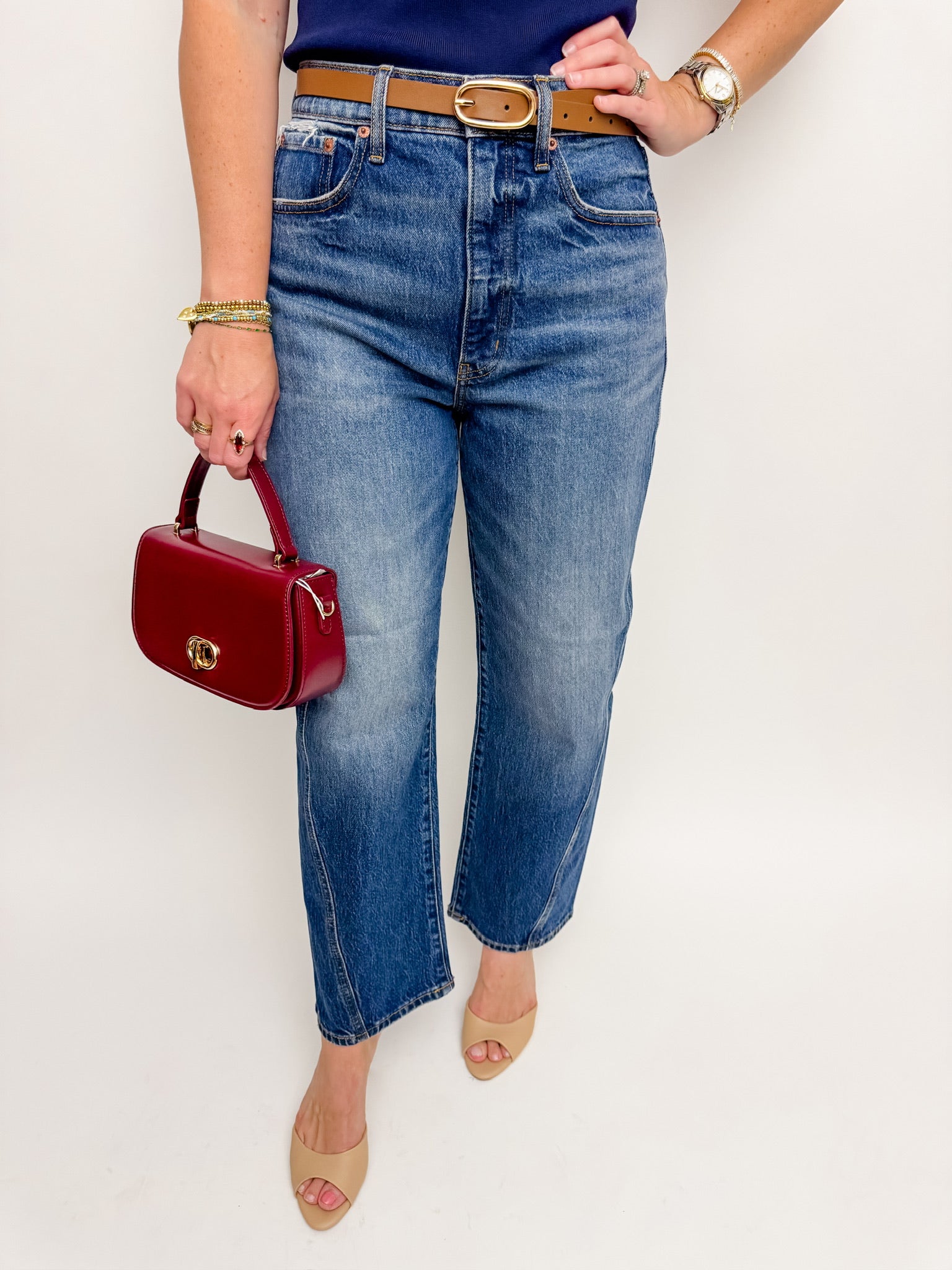 The Westward in Authentic is a high rise jean with a barrel leg silhouette. Featuring a cinched waist, bowed leg, and slightly tapered ankle against a vintage-inspired dark wash, this jean is as versatile as it is flattering. Constructed from Daze Denim's Tough Love fabric, this pair is mostly rigid but yields to your body in all the right ways.