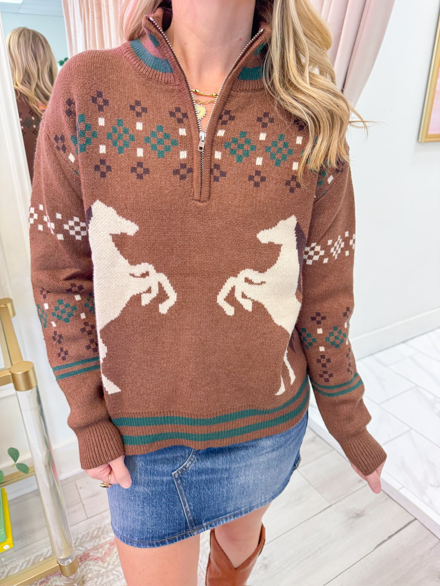 Features: horse knit front, patterned sleeve details, half zip, soft knit