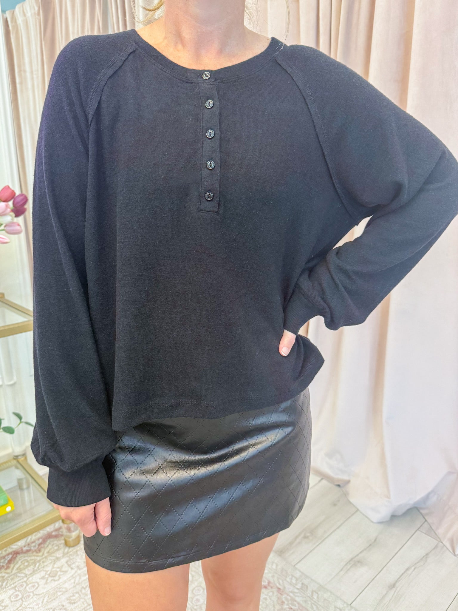 Features: round neck, button front detail, soft knit, bubble sleeve
