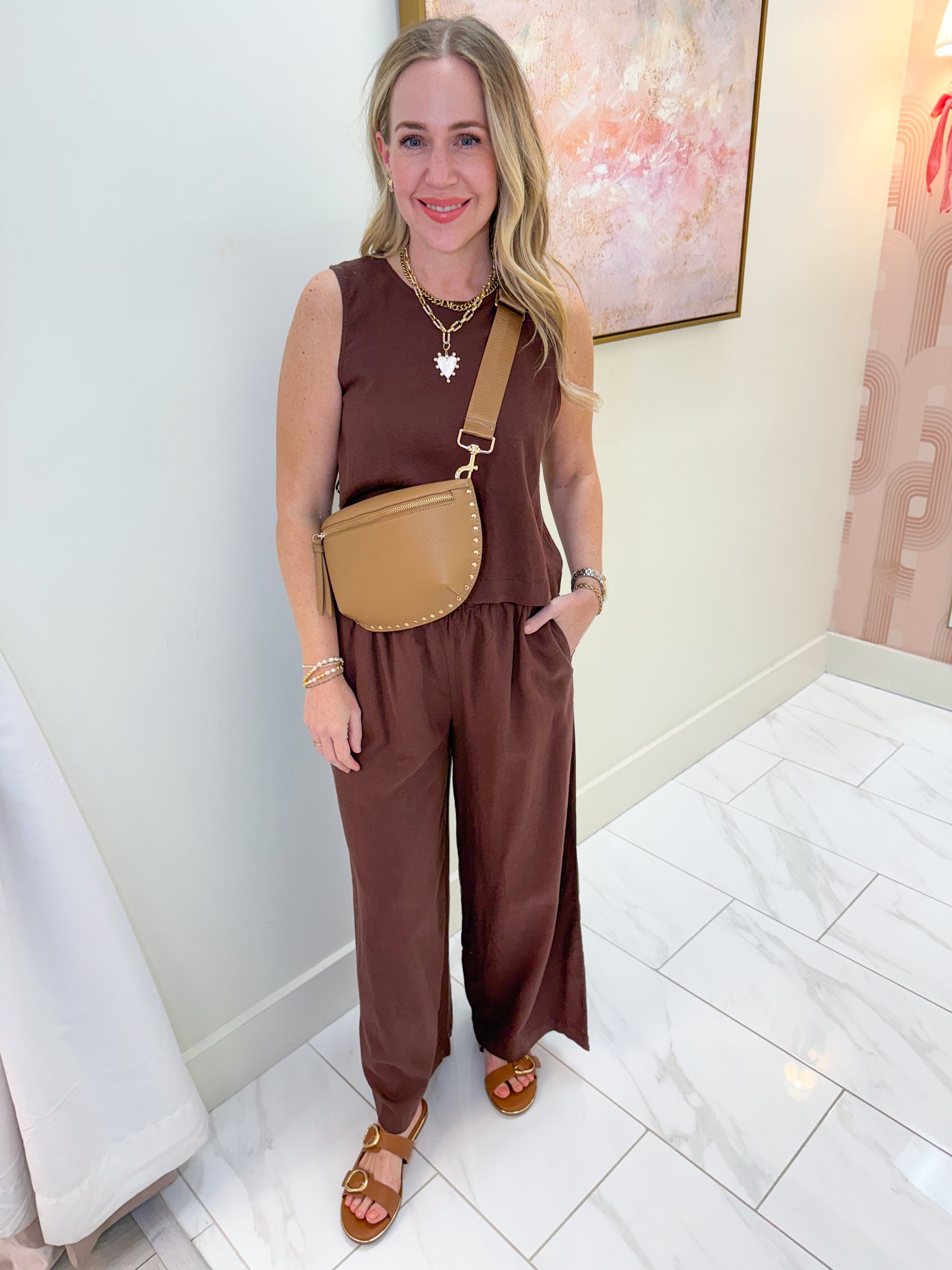 Detailed with an elastic waistband, side seam pockets, and washed linen blend fabric, these high rise pants will be a forever staple in your wardrobe. Make it a set with the ZS Sloane Linen Top.